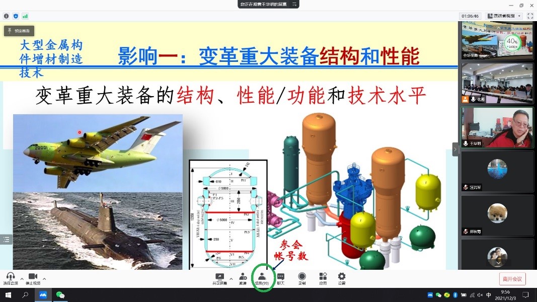 2021年12月3日,我院邀请了中国工程院院士、北京航空航天大学教授、博导王华明院士在线做“高性能大型关键构件增材制造技术对重大装备金属结构材料、结构设计及制造技术的影响”专题学术报告。